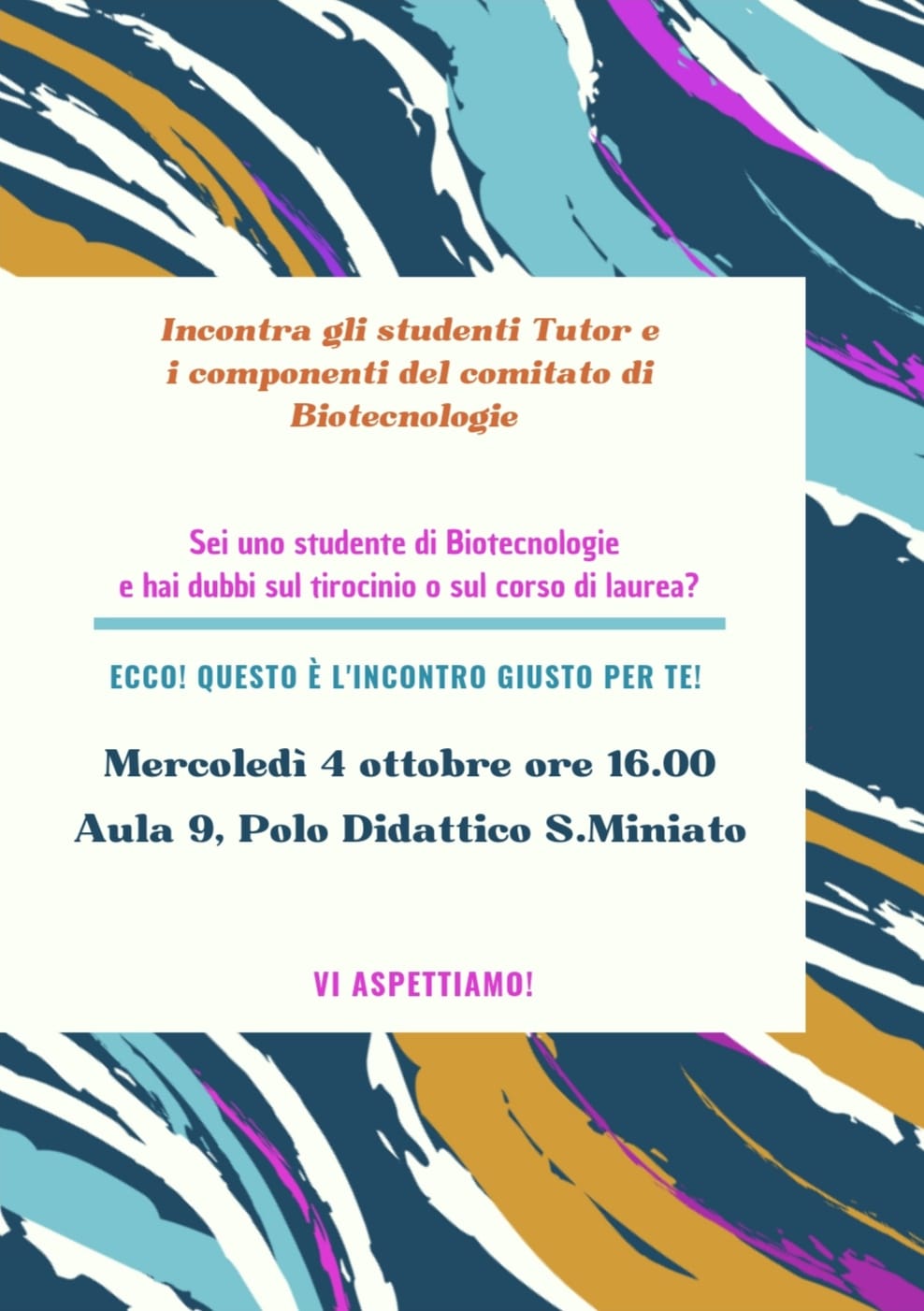 Mercoledì, 4 Ottobre 2023 MERCOLEDI’ 4 OTTOBRE 2023 ALLE ORE 16.00 NELL’AULA 9 DEL POLO DIDATTICO DI SAN MINIATO si terrà L’INCONTRO CON GLI STUDENTI TUTOR ED I COMPONENTI DEL COMITATO DI BIOTECNOLOGIE Documenti allegati: photo-2023-10-04-11-14-29.jpg